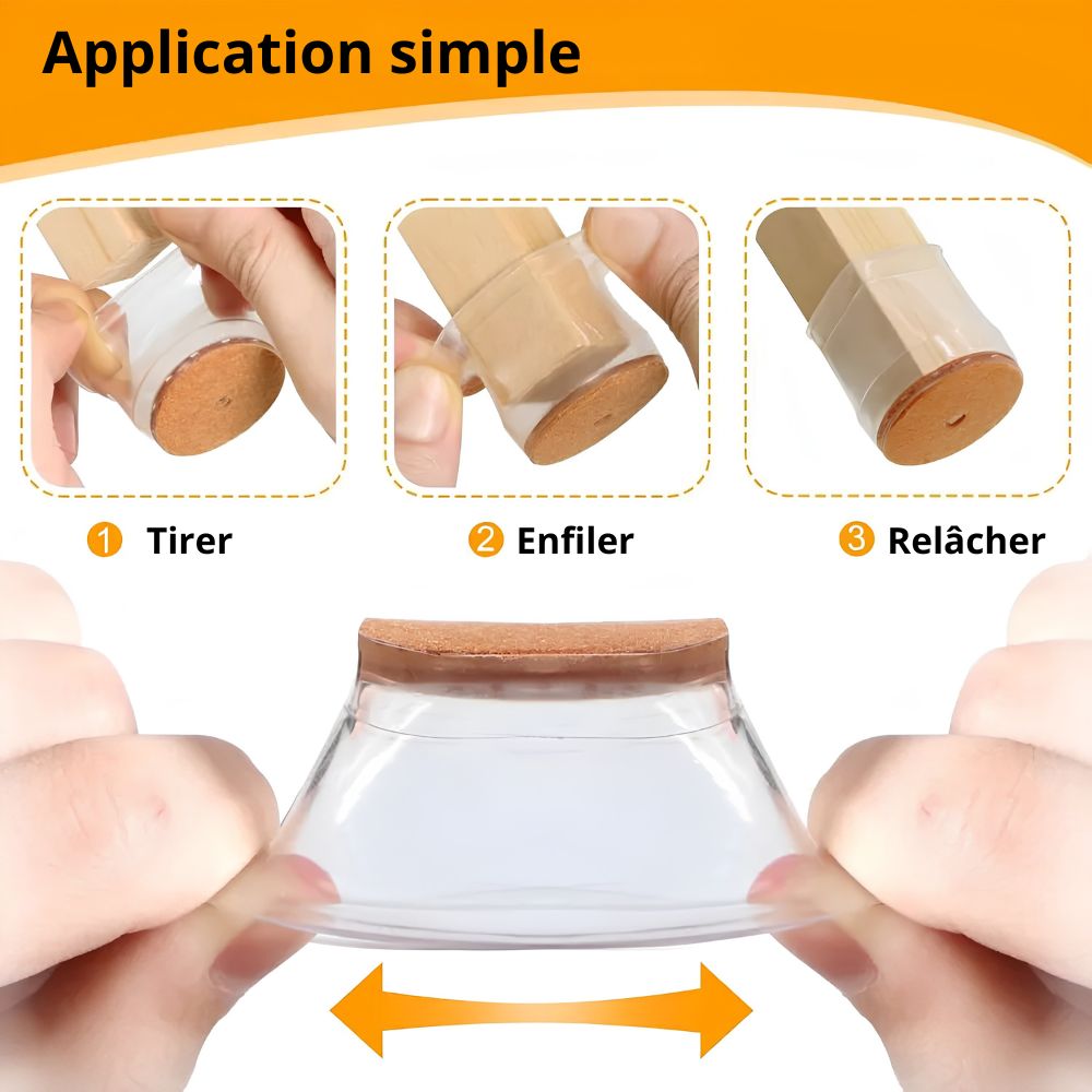 Grâce à sa matière extensible, il épouse parfaitement les pieds de chaise ronds, carrés ou rectangulaires, sans effort d’installation.